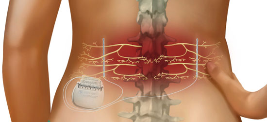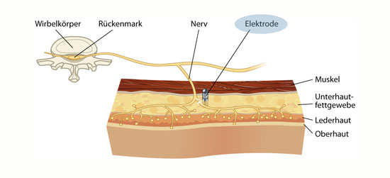 Chronische, gut lokalisierbare Rückenschmerzen, bei denen die Nervenschmerzen überwiegen (neuropathischer Schmerz), können durch eine periphere Nervenstimulation unter der Haut (subkutan) gelindert werden, so dass Ihre Lebensqualität entscheidend verbessert wird. Bei dieser Therapie werden mehrere dünne Elektroden in das Unterhautfettgewebe eingeführt. Über diese gibt ein unter der Haut implantierter Neurostimulator schwache elektrische Impulse ab, und stimuliert so die Nervenfasern im schmerzenden Gebiet. Die Impulse werden an das Gehirn weitergeleitet und überdecken dort die Schmerzsignale. Durch ein externes Gerät kann der Ort der Stimulation und deren Stärke von Ihnen eingestellt werden.